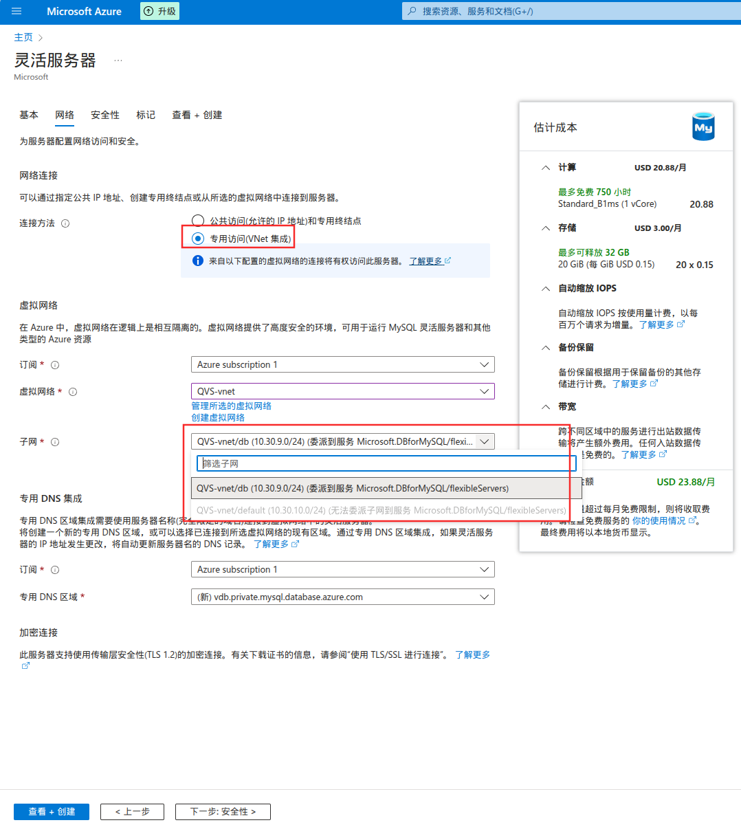 专用访问(VNet 集成) - 选择不同于虚拟机的另一个子网